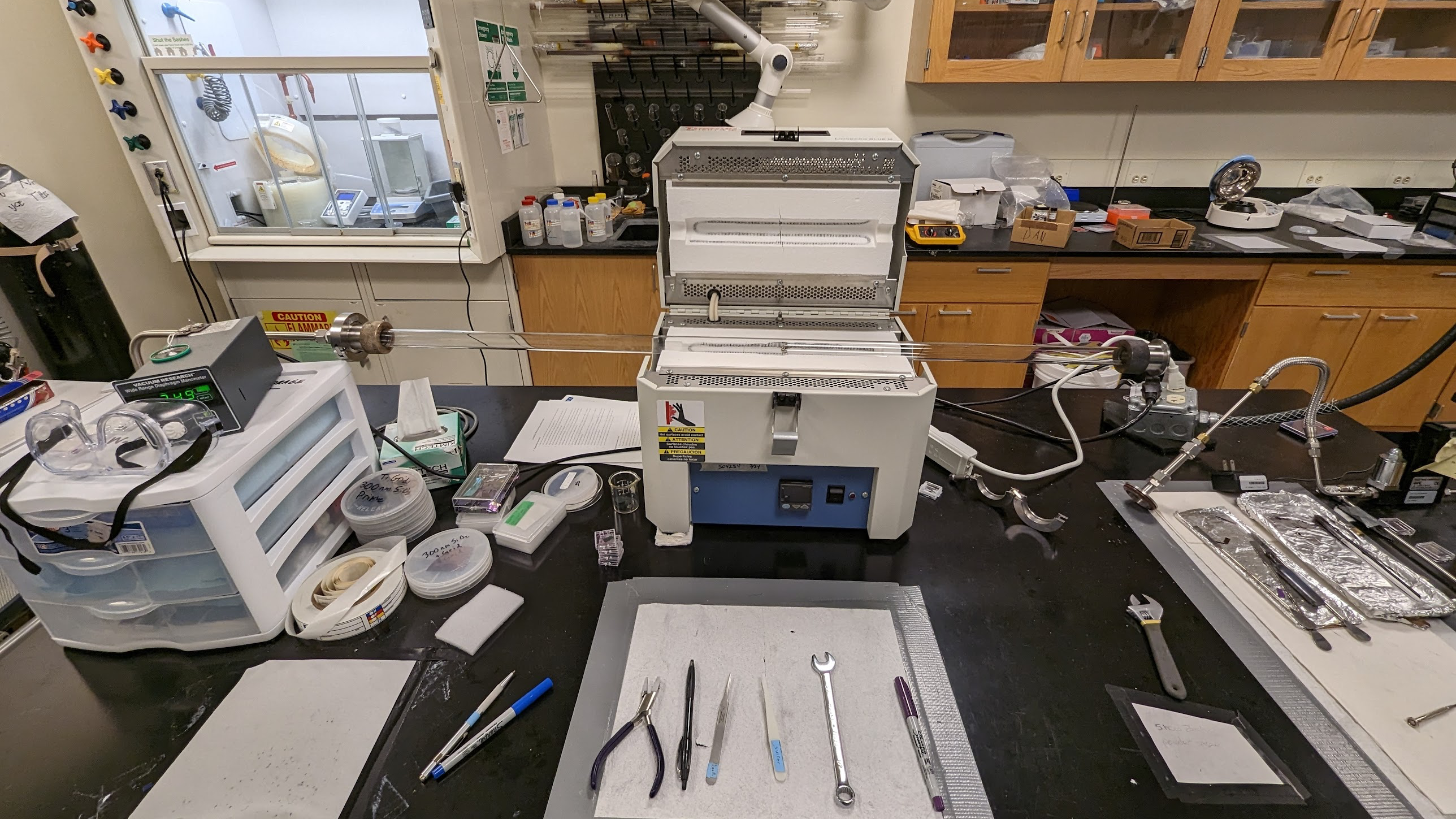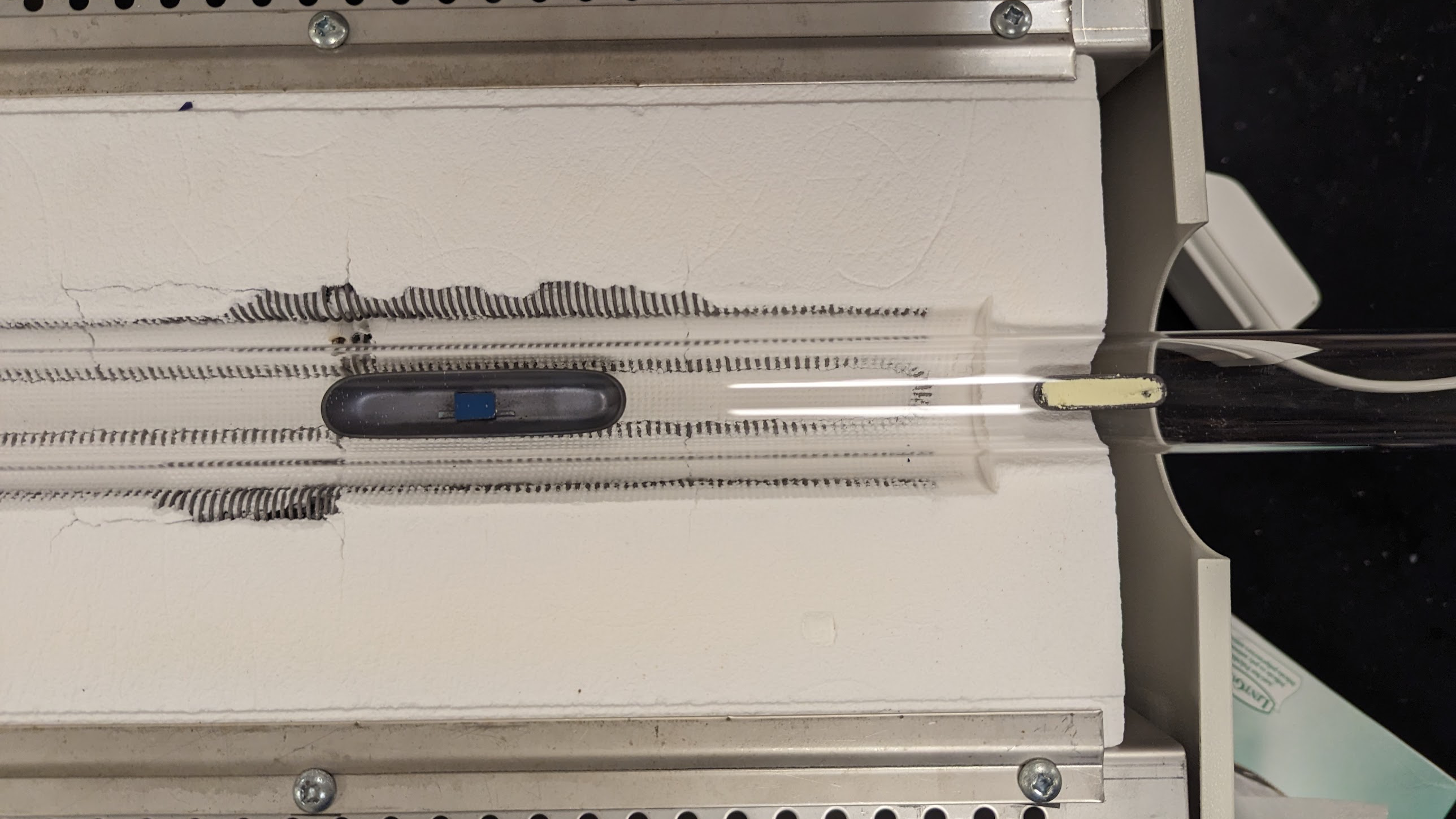 Initially, crystal growth parameters are assumed for the CVD process based on prior calculations and literature review. The quartz tube is cleaned and then placed in the furnace such that the furnace heats its middle portion. The quartz tube is connected on one side to the pressurized argon gas cylinder via a swagelok tube and a digital flow rate sensor. On the other side, the quartz tube is connected to a roughing pump that creates a vacuum inside the tube and the pressure in the tube is displayed using a digital barometer. For the CVD process, two combustion boats are used to hold the reactants. The sulfur boat is filled with the sulfur powder to the brim and a pinch of MoO2 powder is sprinkled in the sample boat. The silicon/quartz wafer piece is placed above the MoO2 powder using tiny rectangular silicon wafer pieces acting as ledges, such that the powder does not touch the wafer piece. The swagelok connecting the tube to the argon gas is opened and the boats are carefully placed at their designated locations inside the tube with the help of a hooked metal rod (shown in Fig. 2).